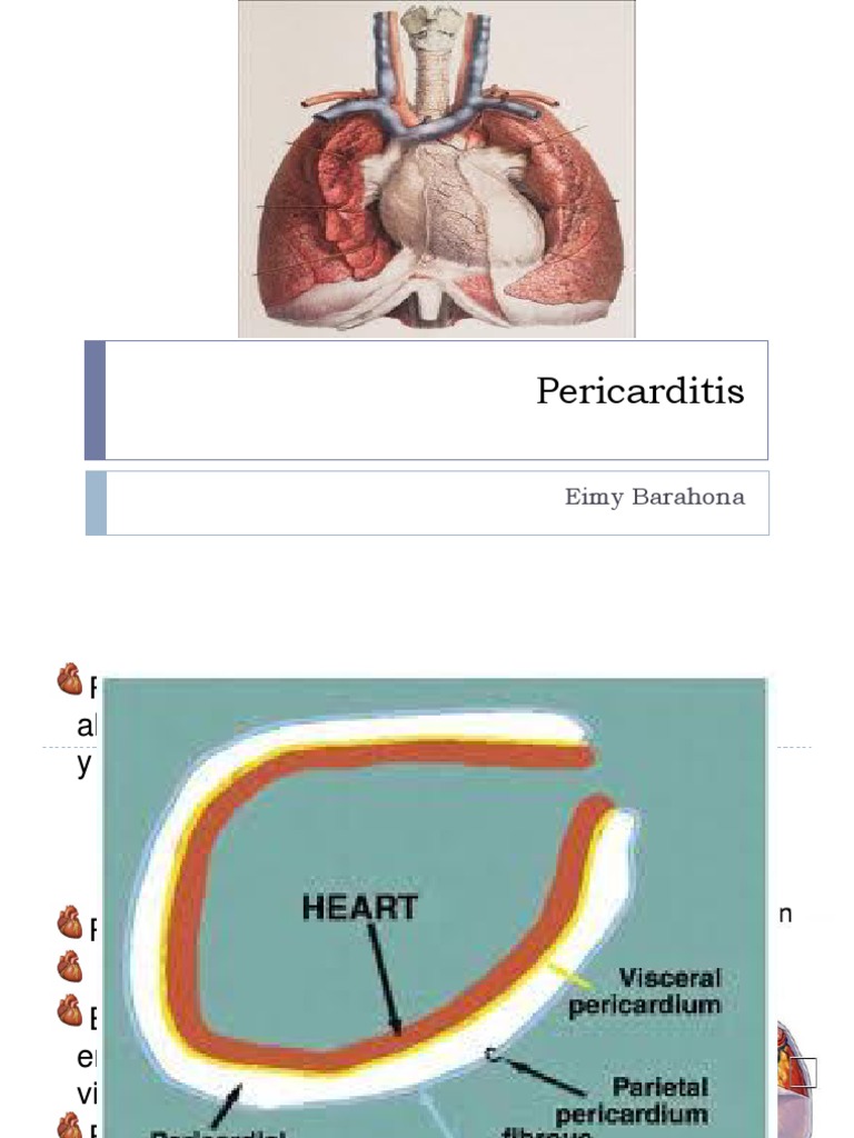 • cardiac pain (ischaemic heart disease, myocarditis, pericarditis) • oesophageal pain (peptic oesophagitis typical signs of invasive infection. • • in all these types of rheumatic pericarditis, focal or diffuse sclerotic adhesions or even complete sclerotic. Acute pericarditis constrictive pericarditis pericardial effusion and cardiac tamponade. Hence, pericarditis is an inflammation of the area surrounding the heart, or an inflammation of the outer layer of the heart, anatomically known as the for example: N chest pain may occur, usually due to concomitant pericarditis.